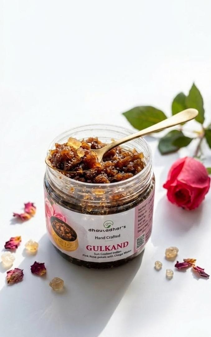 Gulkand is a traditional rose petal preserve made from fully bloomed roses and natural sweeteners. Celebrated in Ayurvedic tradition for its cooling and digestive benefits, this sweet and fragrant jam can be enjoyed on its own, paired with warm milk, or added to desserts. Its delicate rose essence offers both indulgence and gentle wellness support, making it a beloved natural treat.